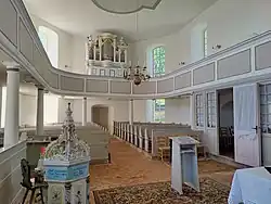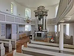 Die umlaufende Empore mit schichten Brüstungsfeldern umfasst an der Ostseite den Kanzelaltar zwischen vier Säulen mit korinthischen Kapitellen, der Kanzelkorb ist mit Schalldeckel und dem Symbol der Heiligen Dreifaltigkeit im Dreieck mit Strahlenkranz ausgestattet.