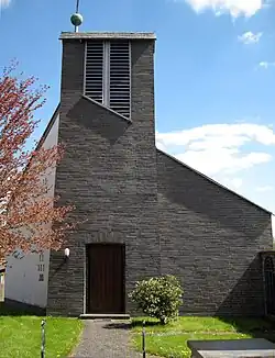 Der modern gehaltene Neubau erhebt sich über einem sechseckigen Grundriss.[4] Seit den 1990er Jahren war das Läuten der Glocken aus Sicherheitsgründen untersagt, da sich im Glockenträger Risse gebildet hatten. Ein Glockenturmneubau im Jahr 1997 löste das Problem.[5] In der Art eines Campanile wurde ein Glockenturm, der stilistisch nicht zum Kirchengebäude passt, errichtet.[6] Im Turm erklingen eine Glocke aus dem Jahr 1795 und zwei aus dem Jahr 1968.