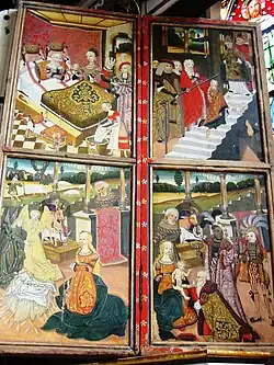 Auf der Innenseite befindet sich ein doppelzeiliger Zyklus, der die Annenlegende Marias darstellt. Der Maler ist auch hier unbekannt, doch fällt das Werk durch die reichhaltige Verwendung von Brokat und unterschiedlichen Granatapfelmotiven auf. Im Bild oben links ist die Verkündigung des Engels an Joachim zu sehen. Er erfährt, dass er nicht länger kinderlos bleiben wird. Die 40 Tage seiner Buße, die er in der Wüste bei einer Herde verbracht hat, sind damit vorbei. Im Hintergrund ist ein Hirte zu sehen, der Dudelsack spielt. Auffallend ist auch der blaue Himmel. Joachim kehrte nun nach Jerusalem zurück und umarmt seine Frau Anna vor dem Eingang der Goldenen Pforte, dem Tempel der Stadt. In der Ferne jagt ein Hund einen Hasen. Das darauffolgende Bild zeigt Anna im Wochenbett in einer prächtigen Kulisse mit edel bespannten Wänden und einer Magd, die gerade die Wäsche macht. Das letzte Gemälde der oberen Zeile zeigt, wie Maria die Stufen zum Tempel hinaufschreitet. Sie wird von einem Priester empfangen, während ihre Eltern Joachim und Anna am Aufgang stehen bleiben.
