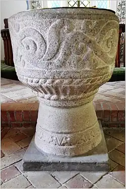 Der romanische Taufstein wurde aus rötlichem Granit gefertigt. Er besteht aus zwei Teilen, dem mit Ornamenten verziertem Becken und dem Fuß. Der Überlieferung nach stammt das Becken aus der Kirche von Ferritslev auf Fünen, die in der letzten Hälfte des 16. Jahrhunderts abgerissen wurde. Er wurde danach unter anderem von einem Schmied als Viehtränke verwendet, landete auf einem Abfallhaufen, wurde danach als Pflanzschale für Wintergrün genutzt, und schließlich fachmännisch restauriert der Kirche in Ørby gespendet. Die Taufschale ist aus Messing und zeigt eine Darstellung der Taufe Christi.