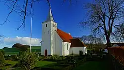 Die kleine Kirche im Dorf liegt nahe dem höchsten Punkt der Mols Bjerge. Der um das Jahr 1200 als romanische Kirche errichtete Bau bestand aus Chor und Kirchenschiff. Für diesen Bereich wurde roher Feldstein als Baumaterial verwendet. Später hat man sie zu einem gotischen Langhaus umgestaltet, bei dem der Chor direkt an das Kirchenschiff anschließt. Die Wiederverwendung der alten Quadersteine ist im Gemäuer der weißen Kirche zu sehen. Der schiefergedeckte Turm und die Kirchenvorhalle wurden erst im 18. Jahrhundert angefügt. Der ehemalige Fraueneingang, mit gotischem Spitzbogen und der Eingang für den Pfarrer mit Flachbogen wurden zugemauert.