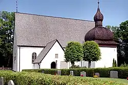 Die Kirche wurde das erste Mal im Jahr 1225 erwähnt und gehört zu den ältesten in der Region. Gegen Ende des Mittelalters wurde die Kirche im gotischen Stil umgebaut. Um 1650 geschah ein weiterer Umbau, bei dem das heutige Kreuzgewölbe aus Holz, das Waffenhaus und ein Grabchor mit Fresken hinzukamen.[1] Ein weiterer Grabchor an der gegenüberliegenden Seite wurde im 18. Jahrhundert angebaut. Der ursprüngliche Kirchturm wurde wohl in den 1760er Jahren wieder aufgebaut.[2]