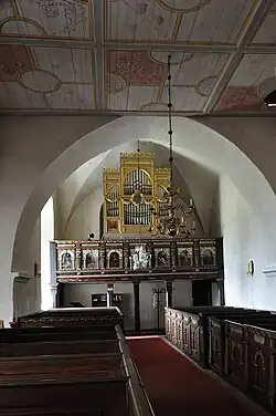 Die hölzerne Altartafel zeigt im Mittelfeld eine gemalte Kreuzigung, die der Inschrift zufolge 1662 ausgeführt wurde und Johan Bartsch[1] zugeschrieben wird. Die Kanzel und das reich mit Skulpturen versehene Taufe aus Sandstein sind auch aus dem 17. Jahrhundert und einer Inschrift zufolge 1672 auf Kosten des Richters Oluf Lundsberg bemalt bzw. 1681 vom Richter Oluf Lundsberg gestiftet worden. Das schöne Gestühl stammt größtenteils aus demselben Jahrhundert. Es wurde allerdings 1936 bei einer Restaurierung ergänzt. Die ungewöhnlich gut erhaltene Orgelempore in der Turmkammer wurde von Nils dem Tischler 1689 hergestellt und einer Inschrift zufolge 1696, wahrscheinlich von „Johan Bartsch dem Jüngeren“ und seinem Sohn Rasmus, bemalt. An der Chorwand zeigt ein Ölgemälde, die Auferstehung Christi, signiert von Fredrik Westin (1782–1862) mit der Jahreszahl 1853; wahrscheinlich eine Donation der Prinzessin Charlotta Eugenia Augusta Amalia Albertina (1830–1889), kurz Eugenia, die während des Sommers im nahen Fridhem wohnte.