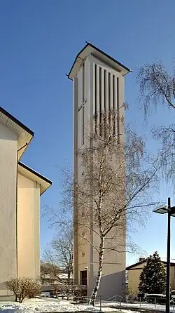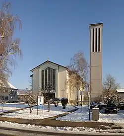 Die katholische Pfarrei aus dem Jahr 1937 musste infolge der rasch anwachsenden Bevölkerung 1957 geteilt werden. Eine Kirche gab es zu diesem Zeitpunkt für die Gemeindemitglieder noch nicht. Erst nach dem Zweiten Weltkrieg holte man beim Erzbischöflichen Ordinariat die Genehmigung für den Kirchenbau ein, die am 12. November 1954 erteilt wurde.[2]