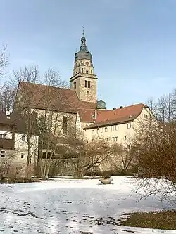 Die Kirchengemeinde Neuenstein[5] umfasst die Stadt Neuenstein sowie den Ortsteil Mangoldsall der Gemeinde Kupferzell und den Haberhof der Stadt Forchtenberg. Kirchlich gehörte Neuenstein zunächst zur Stiftskirche Öhringen. Eine der Hl. Maria geweihte Kapelle wird 1365 erwähnt. Deren Reste sind vermutlich in einem Bau südlich der Kirche enthalten. 1499 wurde die Kapelle zur Pfarrei erhoben und nach der Reformation auch für die Orte Grünbühl, Kleinhirschbach und Obersöllbach zuständig, die früher ebenfalls zur Stiftskirche Öhringen gehörten. Den heutigen Umfang erhielt die Kirche Neuenstein durch mehrmalige Umbauten und Renovierungen in den vergangenen vier Jahrhunderten. So wurde das Schiff 1609/10 durch Georg Kern erneuert. In der Gruft der Kirche ruhen mehrere Angehörige des Hauses Hohenlohe-Neuenstein. Im Chor ist das Grabmal von Graf Wolfgang Julius zu sehen.
