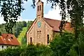 Die Kirchengemeinde Höfen an der Enz[12] umfasst die Gemeinde Höfen an der Enz. Kirchlich gehörte Höfen zunächst zu Wildbad, nach der Reformation zu Calmbach. 1896 wurde in Höfen eine eigene Pfarrei errichtet. Bereits 1892 wurde eine eigene Kirche im neogotischen Stil erbaut.