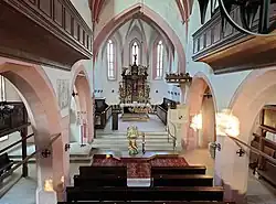 In einem gotischen Steinmetzgewölbe befindet sich eine weitgehend barocke Ausstattung. Die Steinkanzel mit Renaissance-Schalldeckel (1628) stammt von 1562. Der frühbarocke Altar wurde 1670–1673 geschaffen. Die Seitenemporen wurden erst nach der Reformation eingebaut. Bemerkenswert sind außen viele vermauerte Fenster und Zugänge, die auf eine rege Bautätigkeit und die Verwendung der alten Substanz schließen lassen.