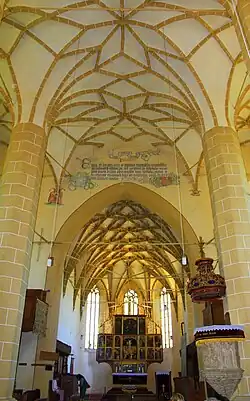 Der Chorraum und die zweigeschossige Sakristei besitzen Netzgewölbe. Das aus drei fast gleich hohen Schiffen bestehende, vierjochige Langhaus wird von einem Sterngewölbe überdeckt, dessen Gewölberippen (aus Stuck) ohne Schlusssteine zusammenlaufen. Drei achteckige Pfeilerpaare stützen das Gewölbe, dessen Rippen an den Seitenwänden auf Kragsteinen aufliegen. Die Gewölbeflächen zwischen den braun angestrichenen und mit weißen aufgemalten Fugen unterteilten Gewölberippen in Chor, Langhaus, und Sakristei weisen im Chorraum zusätzlich aufgemalte Feuerzungenmotive und grüne Spitzstrahlen auf.