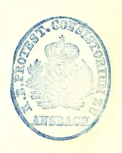 - ↑ Landeskirchliches Archiv der Ev.-luth. Kirche in Bayern (LAELKB, Hg.): Zur Geschichte des Kirchenkreises Ansbach-Würzburg. Eine Ausstellung des Landeskirchlichen Archivs der Evangelisch-Lutherischen Kirche in Bayern. 2. Auflage. Nürnberg 2015. S. 19.