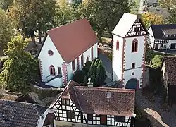 Die evangelische Kirche inmitten des wehrhaft ummauerten alten Friedhofs ist ein kleiner frühgotischer Saalbau, der durch Umbauten seit dem 15. Jahrhundert, vor allem 1738 und 1851/60, sein heutiges Aussehen erlangte. Von der frühen Bausubstanz sind eine Sakramentsnische und ein gotisches Spitzbogenfenster im Chor erhalten. Im Inneren ist die Kirche von einer flachen Decke überspannt und hat im Langhaus eine dreiseitig umlaufende Empore. Die Orgelempore mit einer Orgel von 1851 sowie der Kanzelaltar sind in einer senkrechten Achse vor dem Chor angeordnet, während der Chor selbst als Sakristei abgeteilt ist.