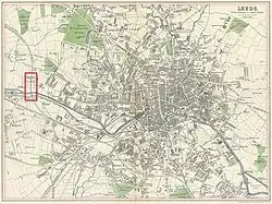Das Kirkstall Road Viaduct wurde in etwa zwei Kilometer Entfernung vom heutigen Bahnhof Leeds errichtet, kurz hinter dem Anschluss an die Strecke nach Dewsbury von der London and North Western Railway. Mit dem Viadukt wurden auf dem ersten Streckenabschnitt der Leeds and Thirsk Railway von Süd nach Nord der Leeds and Liverpool Canal, der River Aire und die namensgebende Straße Kirkstall Road in bis zu 16 Meter Höhe überquert. Die Bauarbeiten starteten auf der gesamten Strecke Ende 1845 und dauerten bis Mitte 1849. Das Viadukt konnte am 29. März[3] und die Gesamtstrecke bis Thirsk schließlich am 10. Juli 1849 eröffnet werden.[4] Zwischen dem Kanal und dem River Aire unterquert die Viaduct Road das Eisenbahnviadukt auf einem eigenen niedrigeren Viadukt ähnlicher Bauart, das vermutlich in den 1880er-Jahren entstand.