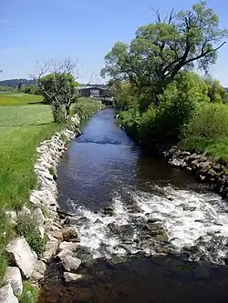 Die begradigte Kirnach bei Ebenhofen, im Hintergrund der Einlauf des Kirnachkraftwerks | ||