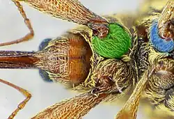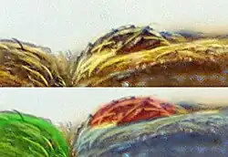 Abb. 6: Schildchen seitlich, Kopie getönt; rot: Schildchen grün: Basis Halsschild blau: Basis Flügeldecken |