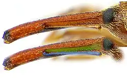 Rüssel von der Seite unten Kopie teilweise gefärbt grün: Fühlerrinne blau: Schaft des Fühlers (Fühlergeißel und Fühler- keule entfernt) |