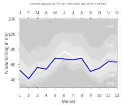 Der Jahresniederschlag fällt mit 707 mm in das mittlere Drittel der in Deutschland erfassten Werte. An 42 % der Messstationen des Deutschen Wetterdienstes werden niedrigere Werte registriert. Der trockenste Monat ist der Februar, die meisten Niederschläge fallen im Mai. Im Mai fallen 1,6-mal mehr Niederschläge als im Februar. Die Niederschläge variieren kaum und sind sehr gleichmäßig über das Jahr verteilt. An nur 7 % der Messstationen werden niedrigere jahreszeitliche Schwankungen registriert.