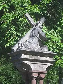 Der etwa 4,50 Meter hohe Kreuzschlepper aus Sandstein wurde um das Jahr 1900 vom Bad Kissinger Bildhauer Valentin Weidner errichtet. Die Figur steht auf vier 1,20 Meter hohen, im romanischen Stil gestalteten Säulen, trägt die Inschrift „Folge mir nach!“ und ist im 1,10 Meter hohen kantigem Sockelblock mit „V. Weidner sculp.“ signiert.