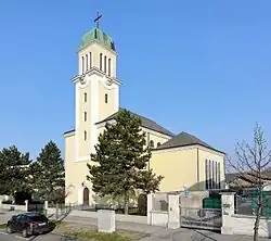 - Pfarrkirche Kittsee: Die dreischiffige Kirche hat einen rd. 36 m hohen (inklusive Kreuz) eingebundenen Westturm mit haubenförmigem Helm und eine halbrunde Apsis. Die Kirche mit einem Fassungsraum für rund 1250 Personen wurde nach den Plänen der Architektin Helene Koller-Buchwieser vom Baumeister Stefan Wilhelm Haderer ab 1948 errichtet und am 16. November 1952 von Bischof Josef Schoiswohl eingeweiht.[9]