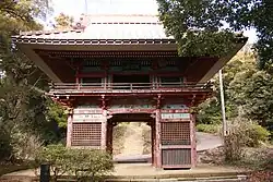 Man steigt hinauf zum Tempelgelände und passiert dabei das mächtige Tempeltor (山門 Sammon; 1 im Plan), das hier in Form eines Turmtores als Niō-Tor (仁王門 Niō-mon), also als Tor mit den beiden Tempelwächtern (Niō) rechts und links vom Durchgang ausgeführt ist. Man steigt eine Treppe hoch zur Ebene der Tempelanlage und hat dann die Haupthalle (本堂 Hondō, 2) vor sich, die ein Pyramidendach besitzt. Zu den wenigen weiteren Gebäuden gehört der Glockenturm (鐘楼 Shōrō; 3).