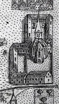 Außen schloss sich an die Kirche westseitig der dreiflügelige, zunächst einstöckige Bau des Spitals an, das ungefähr die Fläche des heutigen Domplatzes einnahm. Im Osten der Kirche, dem heutigen Pfarrhof, wurde ein Friedhof angelegt.