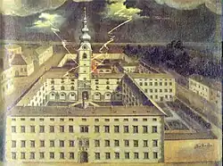 Nach der Aufhebung ihres Ordens durch Papst Clemens XIV. im Jahr 1773 mussten die Jesuiten Klagenfurt verlassen. Das Klostergebäude wurde um eine weitere Etage aufgestockt und fortan als Kaserne genutzt. Diese sogenannte „Jesuitenkaserne“ bestand noch bis ins Jahr 1960 und diente im Kärntner Abwehrkampf kurzzeitig als Internierungslager.[10] Die Kirche, die bis dahin lediglich eine Filiale der Pfarre St. Egid gewesen war, wurde im Jahr 1784 zur Pfarrkirche erhoben. Im Jahr 1787 verlegte der damalige Bischof der Diözese Gurk, Franz Xaver von Salm, seine Residenz von Straßburg (bzw. Pöckstein) nach Klagenfurt und erhob die Kirche zunächst provisorisch und im Jahr 1793 endgültig zum Dom der Gurker Bischöfe.