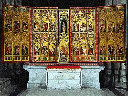- ↑ Norbert Wolf: Deutsche Schnitzretabel des 14. Jahrhunderts. Deutscher Verlag für Kunstwissenschaft, Berlin 2002, ISBN 978-3-87157-194-7.