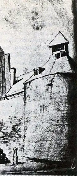 Der nordwestliche Eckturm (Klaren- dann Römerturm) der römischen Stadtmauer markierte zugleich die Begrenzung des dort nach Südwesten abknickenden Klostergeländes. Der nach der Konventsgründung wohl im Volksmund „Clarenturm“ genannte Wehrturm stand mit West- und Nordflügel des Klosters in baulicher Verbindung. Er war durch den Konvent mit einem eingezogenen Latrinenschacht ausgestattet worden, den man mit einer in einem Dachaufbau endenden, notwendigen Lüftung versehen hatte. Wurde in der Nachbarschaft des Turms ein Grundstück oder ein Haus verkauft, hieß es in der Eintragung beispielsweise vor, hinter oder nächst Cloaca in fine retro monast. s. Clara. Er diente so in den häufigen Schreinseintragungen als zusätzlicher Hinweis zur Ortsbestimmung.[10]