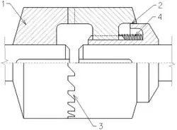 1: Fixe Kupplungsbacke als Gegenhalt zur dazu rechts liegenden, axial verschieblichen Kupplungsmuffe (Schnitt in derjenigen Radialebene, in die auch die axiale Mittellinie hineinfällt), 2: Spielpassung, 3: Umfangsprofil der Klauen im Eingriff, 4: Schraubenfeder