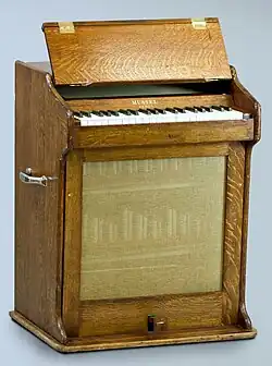 Als Nachfahre des berühmten Erfinders der Celesta August Victor Mustel, gründete dessen Enkelsohn Adolphe Mustel im Jahr 1922 die Firma Société Mustel S. A. in Paris. Bis zu seinem Tod im Jahr 1936 arbeitete er unter anderem an der Entwicklung eines Klaviaturglockenspiels in Form eines Klaviers, welches er als Clavitimbre bezeichnete.[11] Bedingt durch den Zweiten Weltkrieg und den Mangel an Material, insbesondere des Stahls,[12] konnte er seine Ideen nicht realisieren und es bleib bei einem einzelnen Prototypen, an dem er forschte.