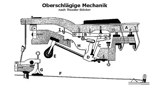 Durch Druck auf das vordere Ende (rechts in der Abbildung) der Taste (A) hebt sich ihr hinteres Ende (links in der Abbildung) mit der darauf befindlichen Stoßzunge (B). Diese stößt gegen die Hammernuss (C) eines im Hammerstuhl (D) mit einer Achse aufgehängten Hammers und schleudert damit den Hammerkopf (E) nach oben gegen die Saite. Nach dem Anschlag fällt der Hammer zurück in den Fänger (F).