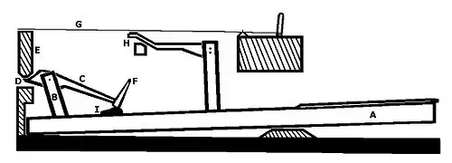 Durch Druck auf das vordere Ende (rechts in der Abbildung) der Taste (A) hebt sich ihr hinteres Ende (links in der Abbildung) mit der darauf befindlichen Kapsel (B), in der an einer Achse der Hammer (C) aufgehängt ist. Dessen hinteres Ende, genannt „Schnabel“ (D), verfängt sich im Absatz einer federnd angebrachten Prellzunge (E) (auch „Auslöser“), so dass sich das vordere Ende hebt und den Hammerkopf (F) nach oben gegen die Saite schleudert. Gleichzeitig wird die Dämpferpuppe (G) nach oben bewegt und hebt den darüber befindlichen Dämpfer (H) von der Saite ab. Nach dem Anschlag fällt der Hammerkopf zurück in den Fänger (I). Beim Niedergang der Taste gleitet das Schnabelleder an der Prellzunge entlang in seine Ausgangsposition zurück.