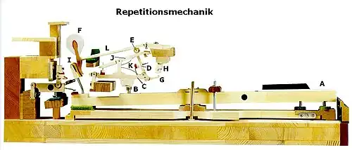 Durch Druck auf das vordere Ende der Taste (A) hebt sich ihr hinteres Ende mit der darauf befindlichen Pilote (B). Die Pilote drückt die Hebegliedeinheit (C) nach oben, so dass die darin beweglich gelagerte Stoßzunge (D) gegen die Hammerstielrolle (E) stößt und den Hammerkopf (F) nach oben schleudert. Bevor er jedoch die Saite berührt, trifft der Auslösearm (G) auf die Auslösepuppe (H), so dass die Stoßzunge (D) aus ihrer Stellung unter der Hammerstielrolle (E) herausbewegt wird. Vorher ist der Repetierschenkel (J) durch die bei neueren Mechaniken an der Hammerkapsel befestigte Abnickschraube von der Hammerrolle gelöst worden – daher auch der Begriff „Repetitionsmechanik mit doppelter Auslösung“.[2] Dadurch ist die direkte Kraftübertragung zwischen Taste und Hammer unterbrochen, so dass der Hammerkopf allein durch den an ihn übertragenen Impuls den restlichen Weg zur Saite überwindet, während die Taste ihren unteren Ruhepunkt erreicht. Nach dem Anschlag prallt der Hammerkopf zurück und wird im Fänger (I) auf halber Höhe gestoppt. Dabei wird der Repetierschenkel (J) nach unten gedrückt und die Spannung auf die Repetierfeder (K) erhöht. Sobald der Fänger den Hammerkopf freigibt, hebt der Repetierschenkel den Hammerstiel (L) so weit an, dass die Stoßzunge (D) in ihre Angriffsposition unter der Hammerstielrolle (E) zurückkehren kann. Dadurch ist das Hebelsystem zu einem erneuten Anschlag bereit, noch ehe die Taste (A) wieder völlig in ihre obere Ruheposition zurückgekehrt ist.