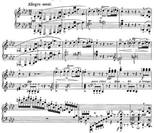 Ein erster Viertakter (T. 1-4) wird von einem zweitaktigen zunächst ab- dann aufsteigenden, punktiert rhythmisierten, gebrochenen f-Moll-Dreiklang gebildet. Durch die im Abstand von zwei Oktaven notierte Unisono-Bewegung wird eine düster unheimliche[14] Wirkung erreicht. Takt 3 und 4 in C-Dur schließen den Viertakter ab und hellen die düstere Grundstimmung – auch durch den enthaltenen Triller – vorübergehend auf. Takt 5 bis 8 bringt eine ungewöhnliche,[14] um einen Halbton höher gesetzte Wiederholung der Figur in Ges-Dur (). Es folgt eine achttaktige Entwicklung (Takt 9 bis 16) welche zuerst einer Abspaltung des Motivs aus Takt 3 und 4 mit einem viermal auftretenden, viertönigen „Klopfmotiv“ kombiniert. Viele Autoren weisen auf die Ähnlichkeit mit dem bekannten „Schicksalsmotiv“ der 5. Symphonie hin.[15][16]) Das vierte Auftreten des Klopfmotivs mündet in Takt 14 in eine virtuose, zickzackartig abstürzende Sechzehntelkaskade, die harmonisch den verminderten Septakkord (e-g-b-des) ausspielt, und am Ende in einen Halbschluss mündet.() Mit Auftakt zu Takt 17 beginnt die Überleitung in einer angegangenen Wiederholung der ersten vier Takte. Vollgriffige, synkopisch aufsteigende Akkordpassagen unterbrechen die wortgetreue Wiederholung und sind von einem extremen dynamischen Gegensatz zwischen ff und p geprägt (). In Takt 23 erfolgt die Modulation. Takt 24 bis 35 bleibt die Harmonie auf der Dominante der Zieltonart stehen. Mit dem in der linken Hand ständig repetierten Es in Achteln grenzt es sich vom Höreindruck deutlich von den vorhergehenden Teilen ab.