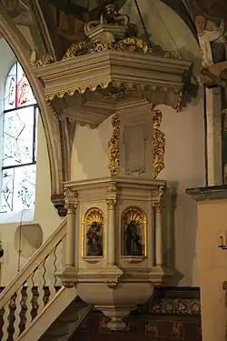 Die barocke Kanzel ist eine einfache Arbeit des 17. oder 18. Jahrhunderts. Sie wurde nach einem Brand der vor 1671 stattfand zusammen mit zwei barocken Altären angeschafft, die jedoch nicht erhalten sind.[13] 1911 wurde der barocke Hochaltar durch den heutigen Hochaltar ersetzt. Er ist eine Stiftung des Kölner Domkapitulars Arnold Steffens. Der Rahmen des neuen Retabels wurde nach einem Entwurf des Kölner Architekten Heinrich Renard ausgeführt und Peter Hecker fertigte das Altarbild mit der Darstellung des sterbenden Arnoldus an. Dieser neue Altar wurde am 30. Mai 1912 konsekriert.