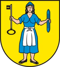 Blasonierung: „In Gold eine blau gekleidete schwarzhaarige Frau mit silberner Schürze, blauer Kopfbedeckung und schwarzen Schuhen, in der rechten Hand einen mit dem Bart nach oben rechts gekehrten schwarzen Schlüssel mit ovalem Schließblatt, in der linken ein blaues Weberschiffchen haltend.“