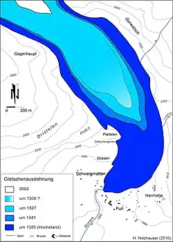 - ↑ Hanspeter Holzhauser: Zur Geschichte des Gornergletschers. Ein Puzzle aus historischen Dokumenten und fossilen Hölzern aus dem Gletschervorfeld. G84. Geographica Bernensia, Bern 2010 (unibe.ch [abgerufen am 23. August 2024]).