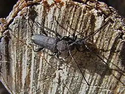 Die breiten und flachen Flügeldecken sind mattgrau. Sie verjüngen sich nach hinten beim Männchen deutlich, beim Weibchen kaum. Die Spitze der Flügeldecken ist gemeinsam verrundet.