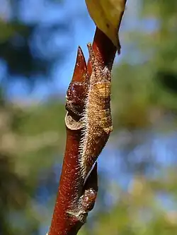 Zur Überwinterung nehmen die Raupen die Graufärbung der Rinde an. Sie überwintern an den Zweigspitzen, oder an der zweiten oder dritten Knospe, indem sie sich eng an den Zweig anschmiegen. Der Anteil vertrockneter Überwinterer ist recht hoch.