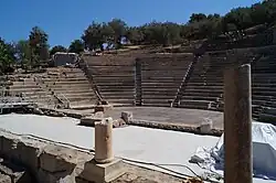 Ursprünglich hatte das Theater Holzbänke, die im Halbrund angeordnet waren, für die Zuschauer. Mitte des 4. Jahrhunderts v. Chr. wurden sie durch Bänke aus lokalem Kalkstein, der in einem Steinbruch nördlich der Akropolis gebrochen wurde, ersetzt. Der Zuschauerraum bot zu dieser Zeit etwa 800 Besuchern Platz. Die Wege wurden mit Steinplatten aus Poros gepflastert. Fast alle Bänke trugen Inschriften mit Namen von Honoratioren und Einwohnern, die sich bei dem Bau verdient gemacht hatten. Die häufige Erwähnung des Dionysos zeigt, dass das Theater diesem Gott geweiht war, mit dem von Pausanias erwähnten Dionysos-Heiligtum[1] in Verbindung stand und rituellen und religiösen Zwecken diente. Im späten 3. Jahrhundert v. Chr. wurde das Theater erweitert und hatte nun etwa 1000 Sitzplätze. Auch aus dieser Zeit stammen einige Inschriften. Die Theaterbühne verfügte – für den Hellenismus typisch – über eine zweistöckige Skene und ein Proskenion.