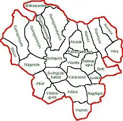 Der Verwaltungssitz befand sich in der einzigen Stadt Gyöngyös (31.018 Ew.). Die 24 Gemeinden (ungarisch Község) hatten eine durchschnittliche Einwohnerzahl von 1.768 (auf je 28,98 km² Fläche). [1][2]