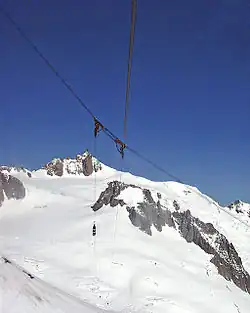 Von dieser Seilstütze aus führt die Seilbahn noch einmal mit einer Spannweite von 447 Metern zur Pointe Helbronner in ebenfalls 3.466 m Höhe, wo sich die Spanngewichte für das insgesamt 10.200 m lange umlaufende Zugseil befinden, das vom Hauptmotor auf der Aiguille du Midi angetrieben wird. In der Station auf der Pointe Helbronner befindet sich ein Notfallmotor.