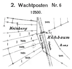 | Wp 8/6 | „Kühbaum“ | ![]() Der auf dem Kühbaum gelegene Turm wurde am Westrand der Kuppe im Bereich einer mächtigen Steinrutsche entdeckt[18] und durch Suchschnitte gesichert, die Karl Schumacher (1860–1934) im Auftrag der Reichs-Limeskommission (RLK) vornahm. Von der bereits damals stark zerstörten Turmstelle waren noch „Mauersteine, Mörtelbrocken und römische Scherben“ auszumachen. Heute ist an dieser Stelle nichts mehr zu sehen.[8][19][20] |