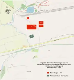 | Haltwhistle Burn II und III | Die Marschlager II und III liegen auf fast gleicher Höhe, 30 Meter von der NO-Ecke des Marschlagers 1 entfernt und 3,5 Meter unterhalb seines höchsten Punktes im Südosten. Lager II hatte einen quadratischen Grundriss, einen Durchmesser von 94 Meter und bedeckte eine Fläche von 0,8 ha. Zu einem späteren Zeitpunkt wurde es durch einen neuen Wall und Graben, die sich über seine Ost-West-Achse erstreckten, in zwei Hälften geteilt. Das neu entstandene Lager, Lager III, nahm die nördliche Hälfte des Vorgängerbaus und eine Fläche von nur mehr 0,3 ha ein. Die Wälle waren bei den Grabungen am Anfang des 20. Jahrhunderts noch maximal 0,3 Meter hoch erhalten. Der äußere Wehrgraben war noch 0,3 Meter tief. Lager II verfügte über drei Eingänge, die zentral an der Nord- bzw. der Ostseite angelegt waren. Bei ihnen waren noch die Überreste der Grabenübergänge zu sehen. Die beiden Tore wurden im Laufe der Zeit durch saisonale Wassereinbrüche ausgeschwemmt. Das Osttor des Lagers II wurde später von der Süd-Ost-Ecke von Lager III überlagert. Nordwestlich des Lager III wurde 1848, an einer heute ausgetrockneten Quelle, ein Weihealtar entdeckt. Gestiftet dem Gott Apollo von Melonius Senilis, ein Duplicarius der aus der Provinz Obergermanien stammte.[9] |