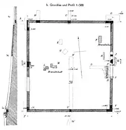 | Wp 2/29 | „Beim Friedhof von Holzhausen“ | ![]() Die beiden quadratischen Holztürme[7] befanden sich auf einer kreisrunden Plattform von etwa 8,50 Meter Durchmesser. Durch die Setzung der Pfosten konnte der innere Turm auf eine Seitenlänge von 2,45 Meter, der äußere auf eine von 5,40 Meter bestimmt werden. Beide Türme waren von Ringgräben umzogen. Der Durchmesser des inneren Ringgrabens betrug 12 Meter, an seiner nordöstlichen Seite war er durch einen 0,80 Meter breiten Erdsteg unterbrochen. Der äußere Ringgraben wies einen Durchmesser von etwa 20 Meter auf. Seine nordöstliche Seite wurde vom Limesgraben überschnitten. Der gesamte Befund war von mächtigen Brandschuttschichten auf eine solche Art und Weise bedeckt, dass für beide Türme die Zerstörung durch Feuer als sicher angenommen werden muss. Der Limesgraben war südöstlich der Holzturmstelle und unmittelbar vor dem Steinturm auf einer Breite von rund zwölf Metern unterbrochen. An Palisadengräben wurden gleich drei festgestellt. Der Zusammenhang ist weitgehend unklar, jedoch dürften der äußere und der innere Graben aufgrund ihrer geringen Tiefe nur schwerlich zur Aufnahme der schweren Palisadenstämme geeignet gewesen sein. Innerhalb des Gesamtbefundes wurden auch noch ein Grab und eine Grube der La-Tène-Zeit freigelegt. |