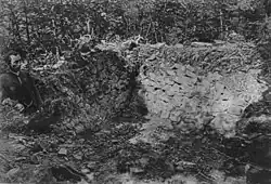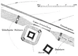 | Wp 1/13 | „Am Rennweg“ | Wahrnehmbare Überreste[32] eines 5,30 × 5,30 m großen, ungefähr 52 m vom Wallgraben entfernten Steinturms mit 90 cm mächtigen Mauern. Ein Holzturm wurde anhand des keramischen Fundmaterials nachgewiesen.[33] |