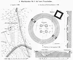 | Wp 1/11 | „Auf dem Freßhelder“ | ![]() ![]() Spuren eines älteren Holzturmes[29] von 4,75 × 4,35 m Seitenlänge, der von einem 19 m durchmessenden Graben großzügig umfasst war, konnten unmittelbar südwestlich des Steinturms nachgewiesen werden. Etwa 100 Meter südlich der Turmstelle kreuzt der dort nicht wahrnehmbare Limes den Verlauf einer mittelalterlichen Landwehr, die sich noch deutlich im Gelände abzeichnet.[30] |