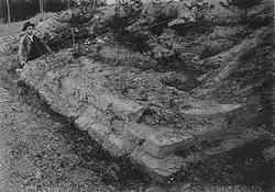 - ↑ Westliches Pfostenloch: 0,50 m Durchmesser mit Pfostenstandspur von 0,30/0,35 m. Südliches Pfostenloch: 0,60 m ohne Standspur.