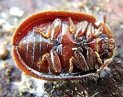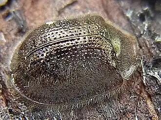 Der Käfer ähnelt sehr einem Schildkäfer, was auch die anfangs falsche Zuordnung durch Fabricius 1787 erklärt: Halsschild und Elytren (Flügeldecken) bilden in der Aufsicht ein Oval, das schildartig über Kopf, Brust und Hinterleib hinausragt (Abb. 1). Die Form der Fühler und die Anzahl der Tarsenglieder zeigt jedoch eine ganz andere Verwandtschaft. Der Käfer erreicht eine Länge von fünf bis sieben Millimetern bei einer Breite von gut drei bis knapp 4,5 Millimetern. Der stark glänzende Käfer ist unterseits intensiv rotbraun, oberseits dunkel bronzefarben. Halsschild und Flügeldecken werden zum Rand hin durchscheinend rotbraun, der Rand ist dicht bewimpert. Die Oberseite ist dicht fein abstehend behaart, besonders am Halsschild. Die Behaarung kann jedoch abgerieben sein. Die Unterseite ist gelblich anliegend behaart. Innerhalb des breit nach allen Richtungen abgesetzten Randes ist die Oberseite des Käfers kräftig gewölbt, die Unterseite dagegen ist kaum gewölbt. Der Käfer ist mit einem hauchdünnen weißlichen Reif bedeckt, der leicht zerstört werden kann, aber vom lebenden Tier nachgebildet wird.[15] Dieser Reif ist auf Fotos nur ausnahmsweise zu sehen.[22]