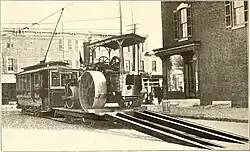 Klemmeinheit an einer Dampfwalze gegen unbeabsichtigtes Wegrollen beim Transport (um 1900)