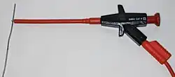 Klemmprüfspitze mit Federdrahtklammern an einen Draht angeklemmt, mit eingestecktem Bananenstecker
