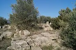 Der von Pausanias erwähnte Athena-Tempel auf der Akropolis konnte bisher noch nicht lokalisiert werden. Er beherbergte eine Athene-Statue der Bildhauer Dipoinos und Skyllis.[22] Nur die Fundamente eines mittelalterlichen Turmes konnten bisher auf dem höchsten Punkt der Akropolis entdeckt werden. Er hatte eine Grundfläche von 8 × 5 m und wurde aus Spolien errichtet. Auf dem westlichen Hügel fand man in einem 300 × 250 m großen Bereich früh- und spätmykenische Tonscherben (SH I/II–IIIB; 1500–1190 v. Chr.).[23]